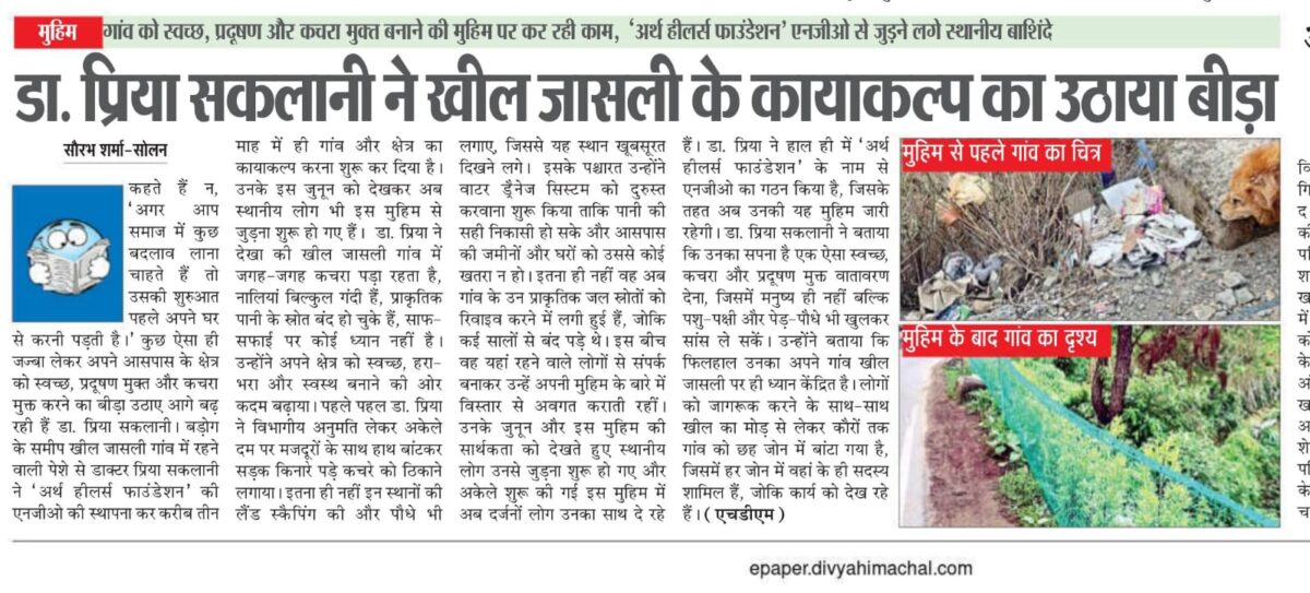 Dr. Priya Saklani developed what became one of Earth Healers Foundation's most distinctive approaches: the sidewalk garden. After clearing each dumping site of accumulated waste, our team prepared the soil, laid stone borders, and planted flowering plants, shrubs, and native trees in their place.Over 200 plants were planted across multiple sites in Kheel Jasli — transforming neglected, stinking corners into pockets of green and colour along the roadsides.